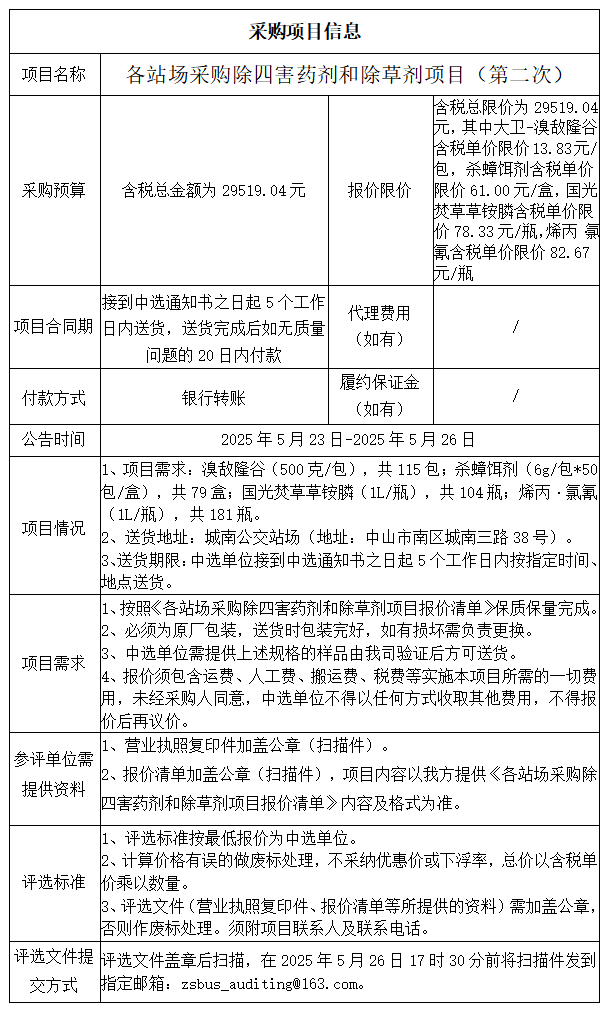中山市公共交通运输集团有限公司各站场采购除四害药剂和除草剂项目(第二次)