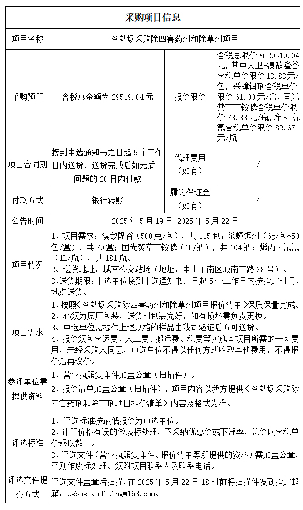 中山市公共交通运输集团有限公司各站场采购除四害药剂和除草剂项目