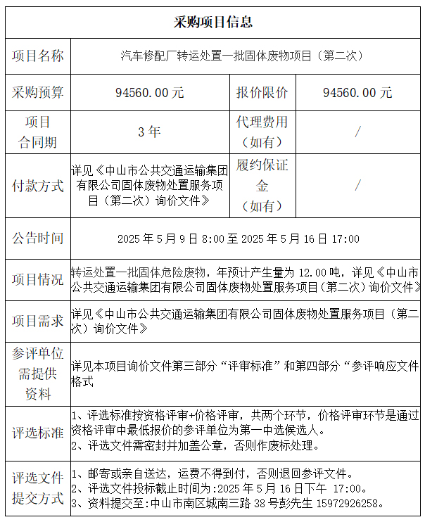 中山市公共交通运输集团有限公司固体废物处置服务项目询价文件(第二次)
