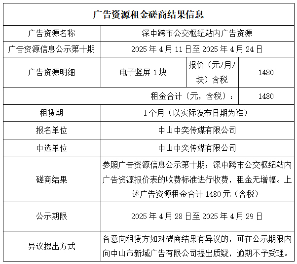 中山市新域广告有限公司深中跨市公交枢纽站内广告资源租金磋商结果公示