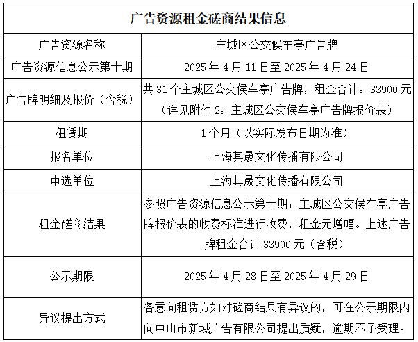 中山市新域广告有限公司主城区公交候车亭广告牌广告资源租金磋商结果公示
