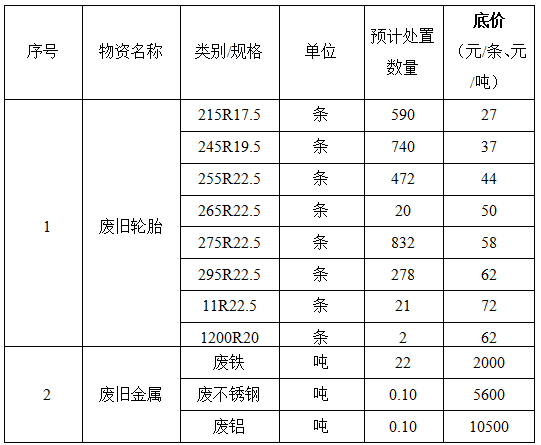 公开询价的方式选取一家废旧物资回收企业回收处置废旧轮胎、废旧金属。预计废旧轮胎处置数量约3000条,废旧金属约22吨(具体数量以合同期内实际生产为准)。废旧物资在生产过程中持续产出,分散存放于我司属下12个站点(中山市内),储存一定量后中选人需自行派车到各个站点上门装载、转运、回收(每个站点大致每月需转运一次)。