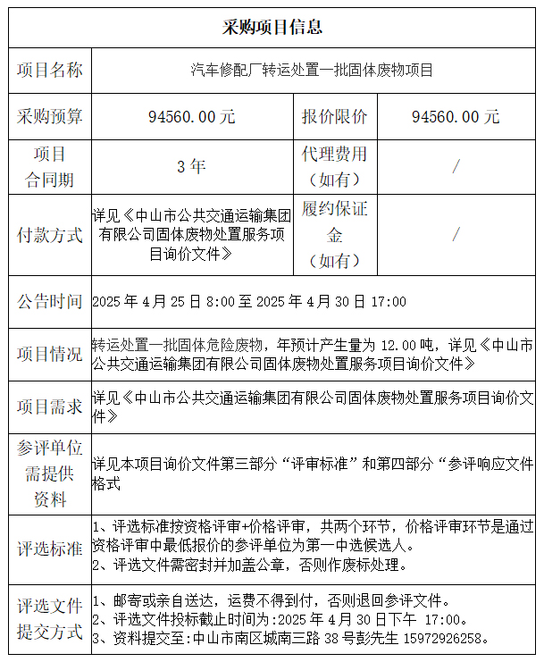 中山市公共交通运输集团有限公司固体废物处置服务项目询价文件