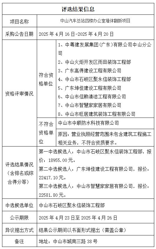 中山市公共交通运输集团有限公司中山汽车总站四楼办公室墙体翻新项目评选结果公示