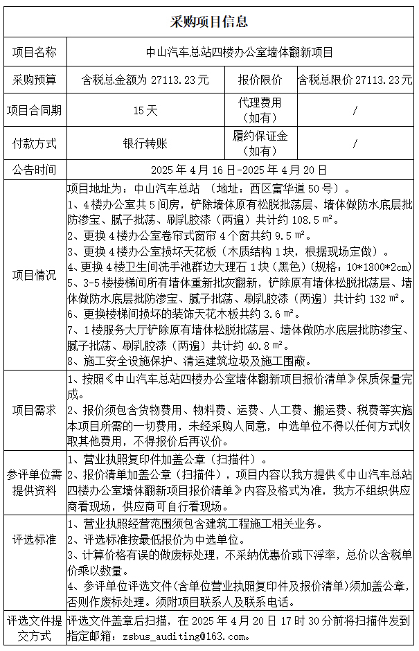 中山市公共交通运输集团有限公司中山汽车总站四楼办公室墙体翻新项目