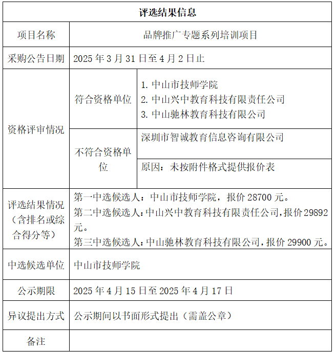 中山市公共交通运输集团有限公司品牌推广专题系列培训项目评选结果公示