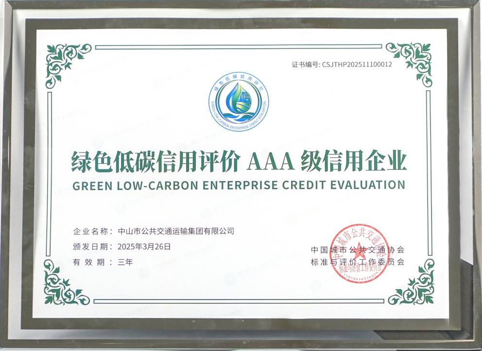 近日,中国城市公共交通协会公布《中国城市交通行业绿色低碳信用评价》评审结果,中山公交集团凭借在绿色低碳领域的卓越表现,荣获绿色低碳信用评价aaa级企业评级。