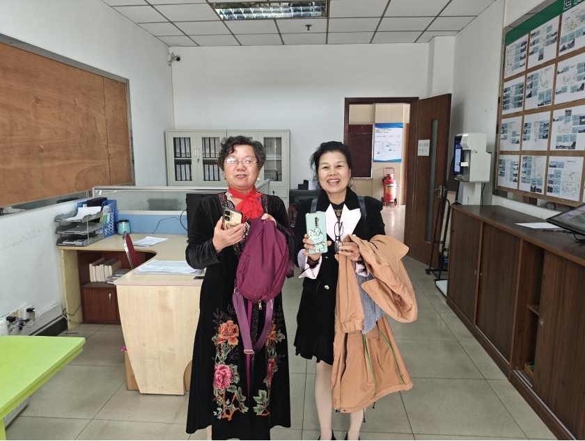 图为失主黄女士和傅女士在坦洲车队领取遗失的物品