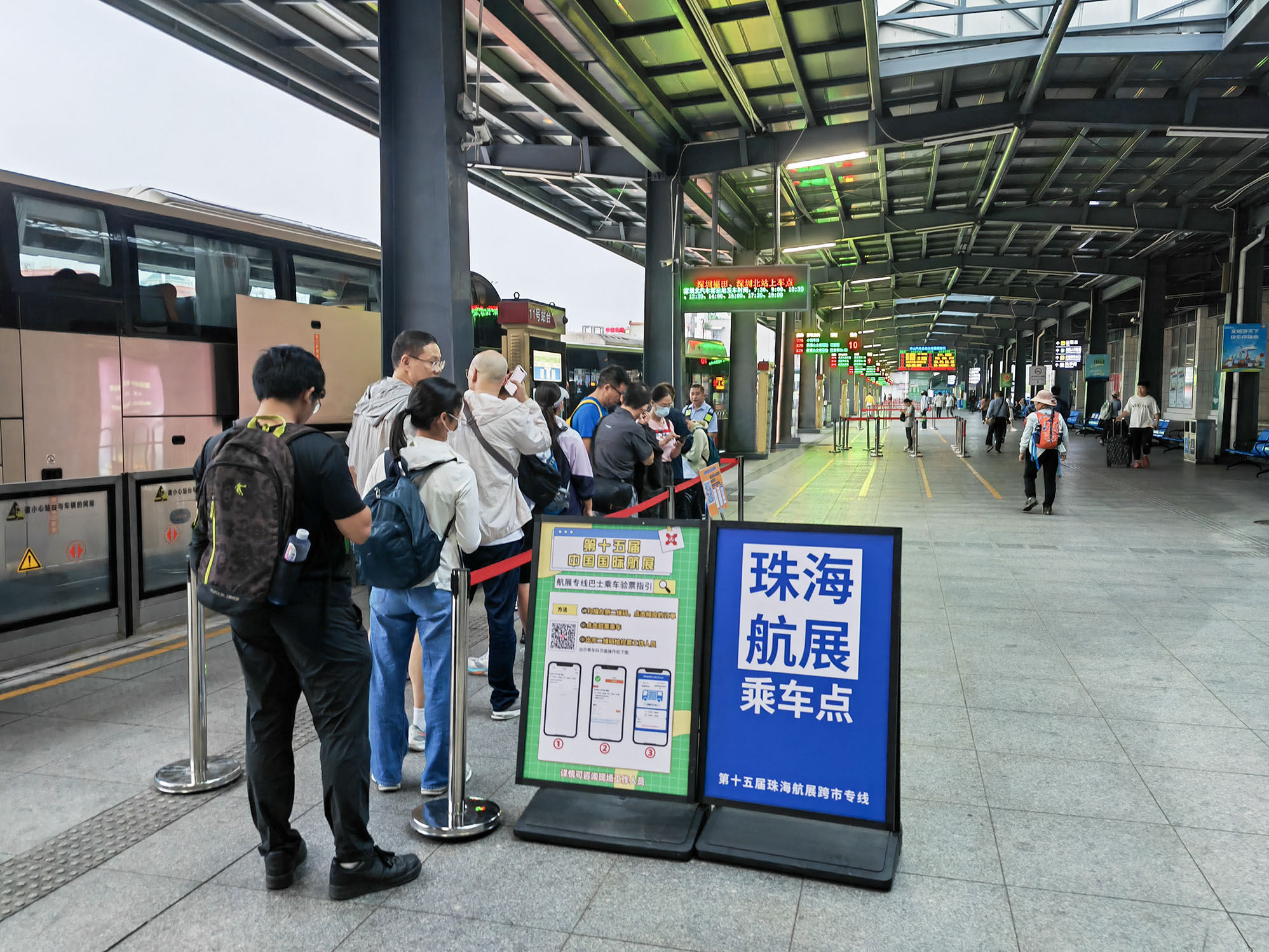 图为市民排队乘坐珠海国际航展中心跨市专线车