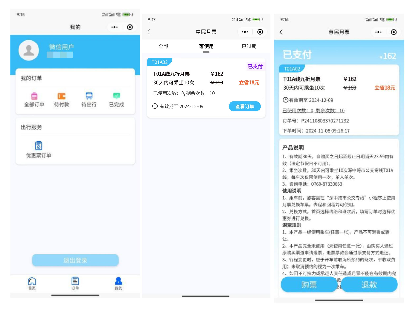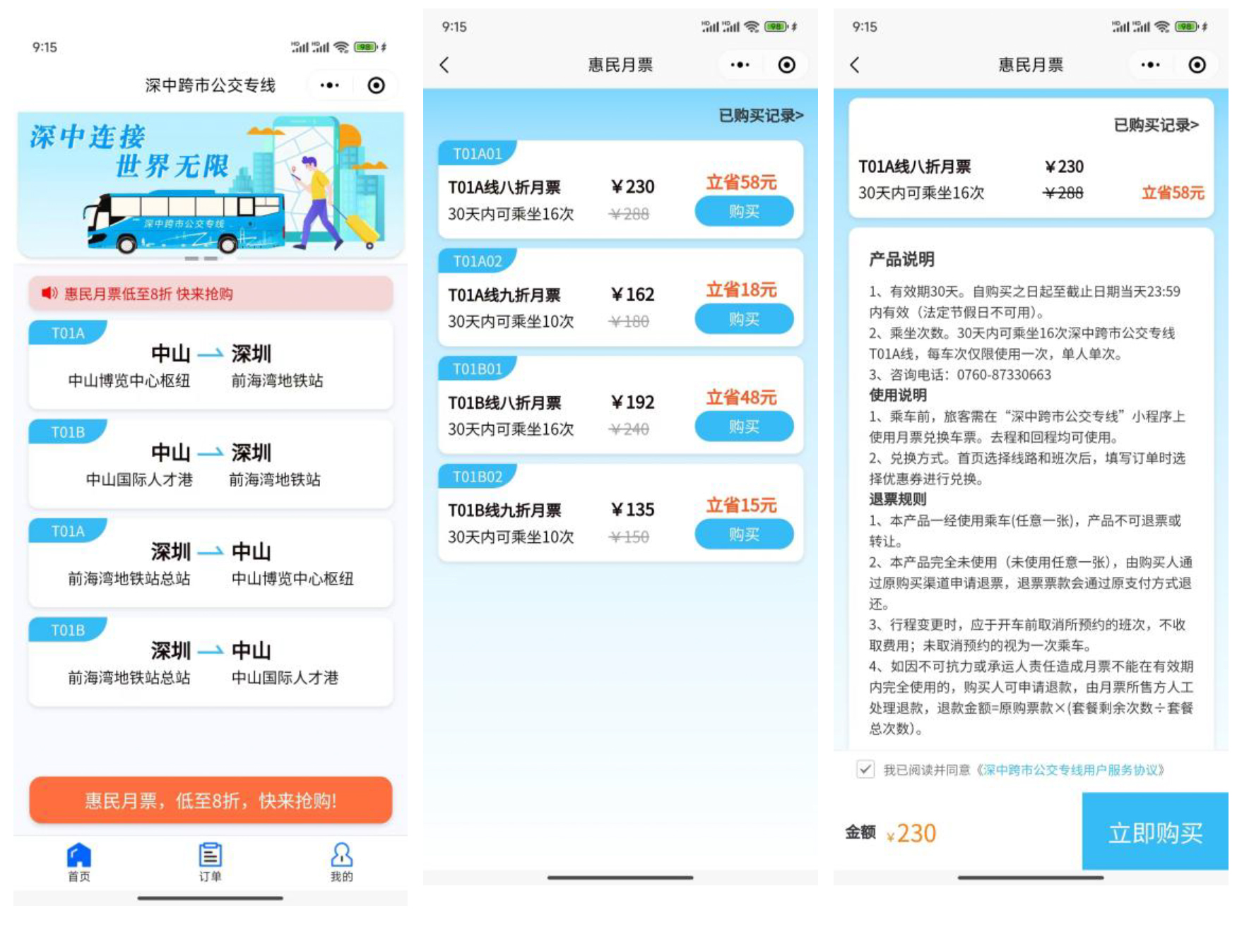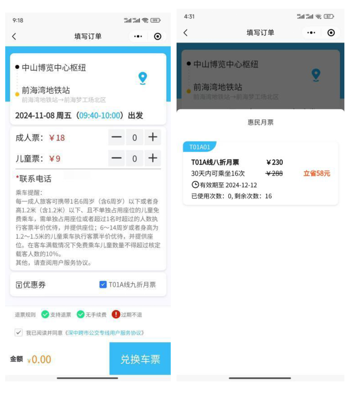 乘车前:在“深中跨市公交专线”微信小程序预约出行对应线路及班次,并在“优惠券”一栏勾选使用月票抵扣支付。