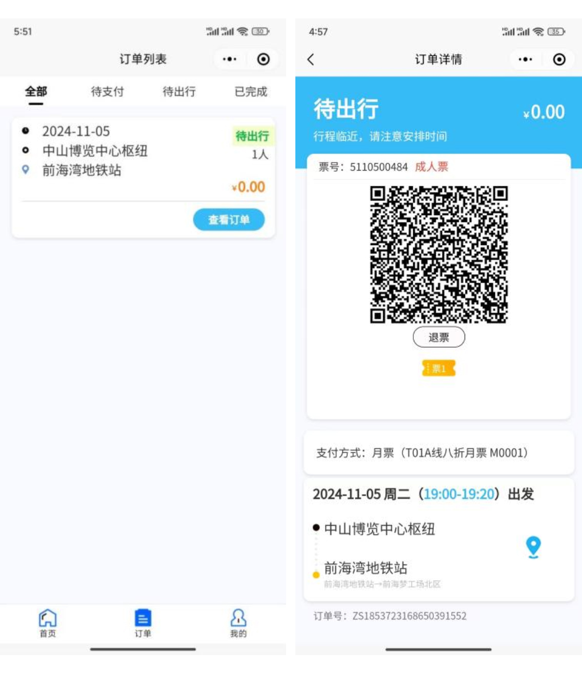 市民在乘车前,需在“深中跨市公交专线”小程序上使用月票兑换车票,去程和回程均可使用。完成购票后,市民在订单页面查询待出行订单,并在乘车前出示二维码验票,免去纸质月票乘车需核对身份证信息的步骤。