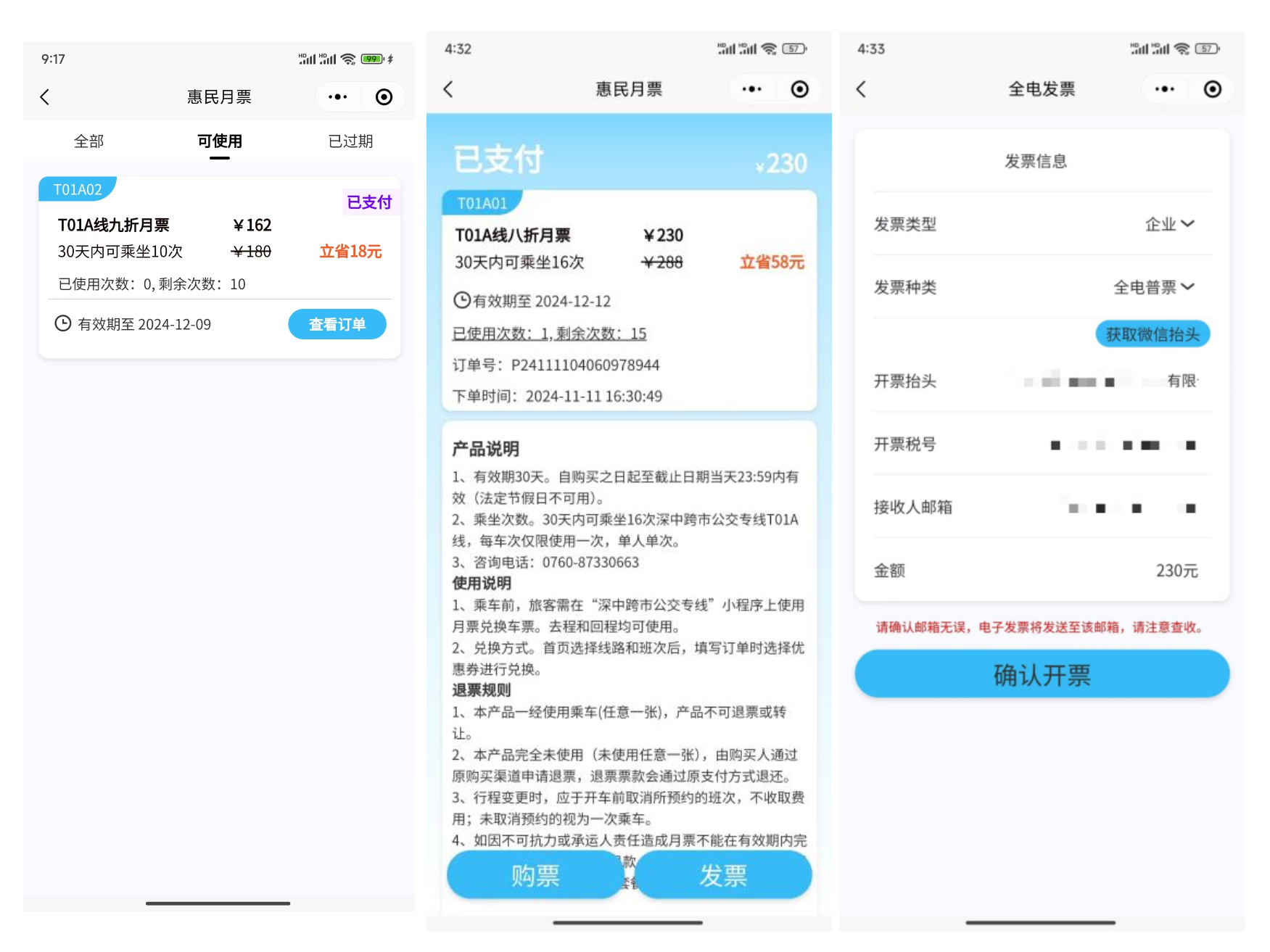 乘客需开具发票的,须先完成一次使用乘车记录(即完成一次验票乘车),方可在“深中跨市公交专线”微信小程序申请开具发票。流程如下: