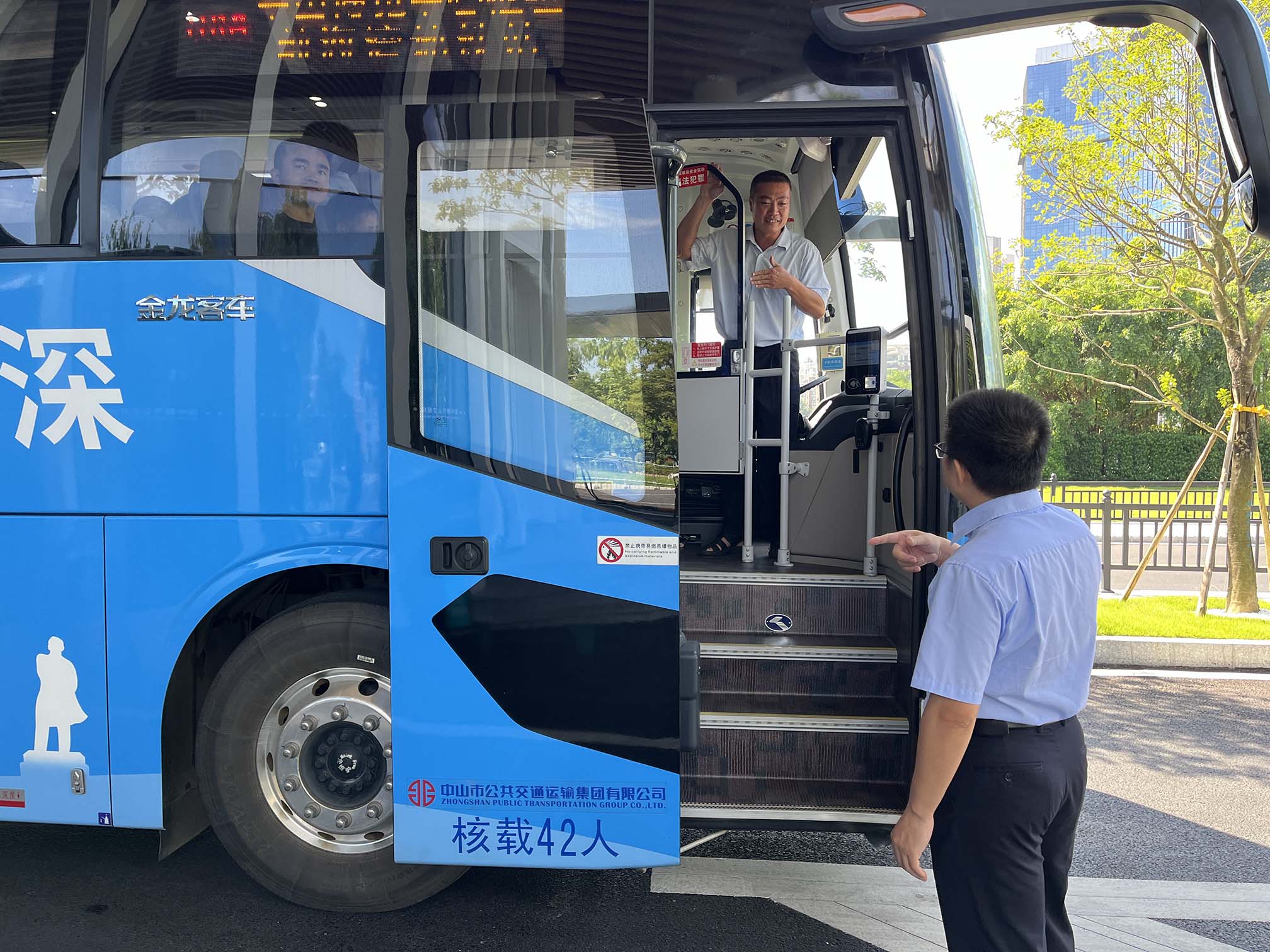 图为中山公交集团班子成员提醒深中跨市公交驾驶员安全驾驶