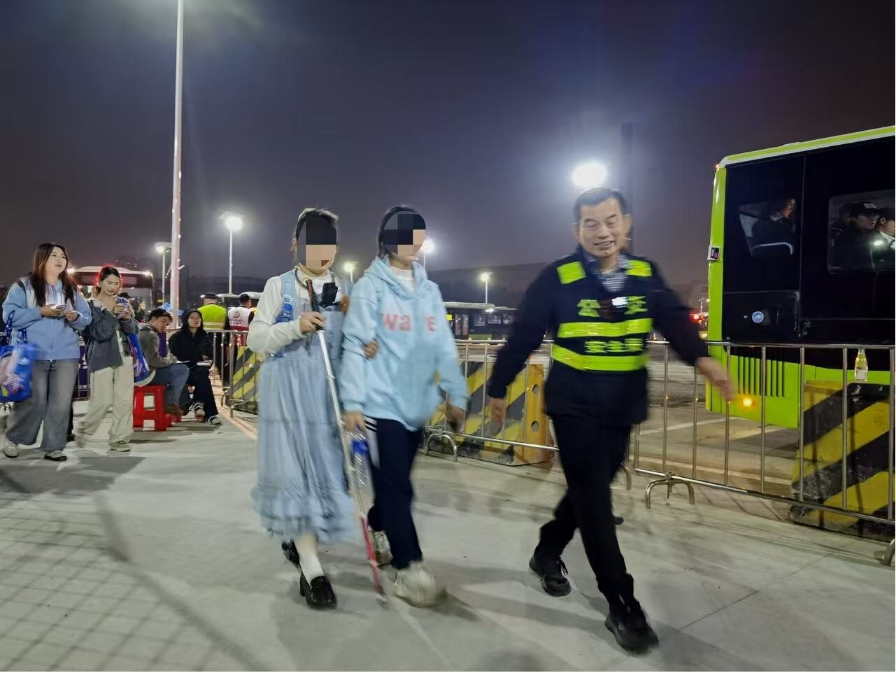 图为公交安全员指引视障人士离场