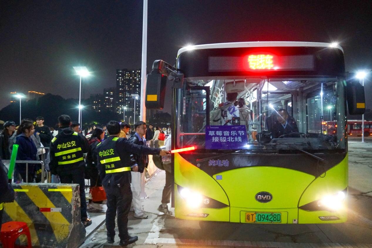 据悉,为高效、安全、有序地应对晚间疏散客流高峰,中山公交集团在活动现场及关键点位安排管理人员和公交志愿者进行现场调度与秩序维护,引导乘客有序乘车。“请前往博览中心的乘客排队有序上车”“对,公交服务是免费的,您放心上车就行”,音乐节期间,两日累计194名中山公交人主动放弃休息,前往现场参与疏导服务。在他们的热情服务与耐心指引下,2.5万人次的乐迷安全有序地搭乘公交疏散,许多乐迷在车上仍不忘对公交的服务点赞。