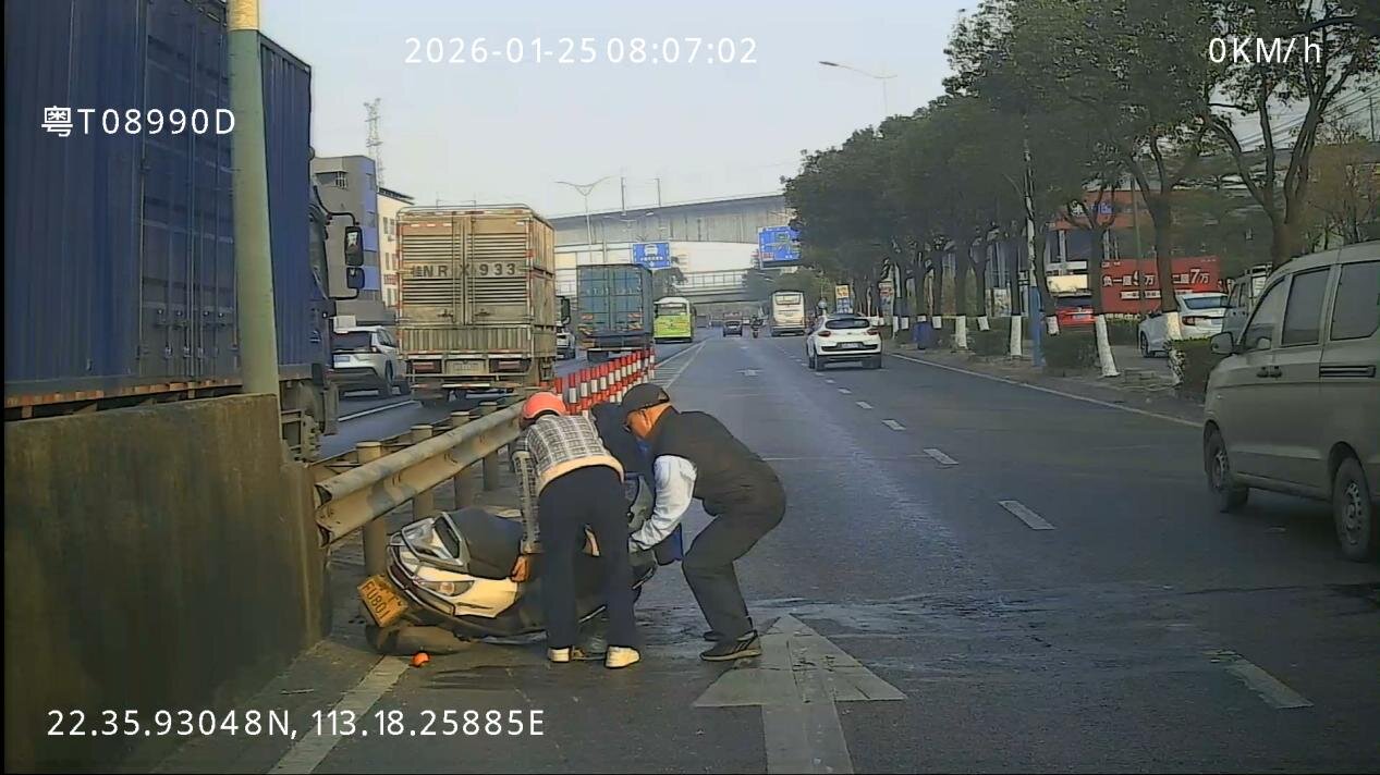 1月15日,黄圃车队308线路驾驶员吴培芳驾驶公交车辆行至南头镇金盛隆超市门口交通灯路口时,救助一位骑电动车不慎倒地的老人,并和路过的热心市民一起将老人搀扶至安全区域细心查看,确认无恙后才离去现场,继续营运。