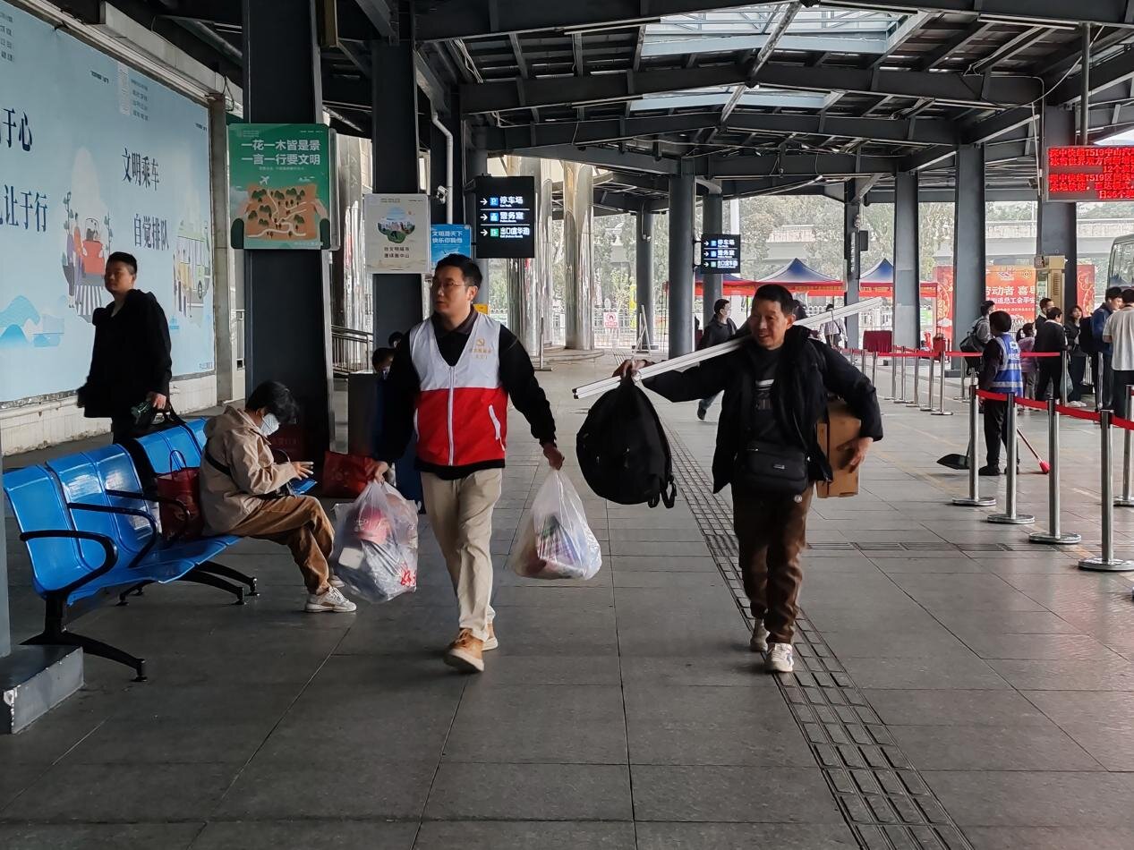 图为公交党员志愿者协助市民提行李