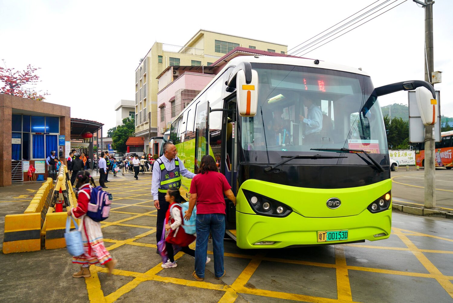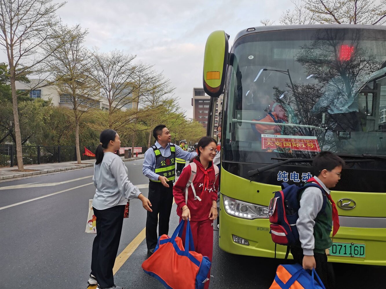 图为中山公交集团工作人员引导学生有序下车