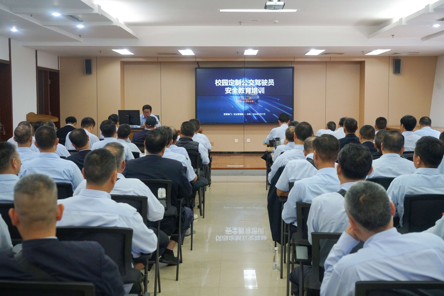 图为2026年春季开学前途经学校定制公交驾驶员安全服务教育专题培训现场