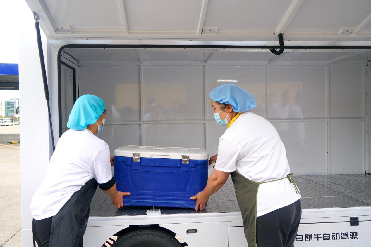 图为工作人员将员工餐装上无人物流车