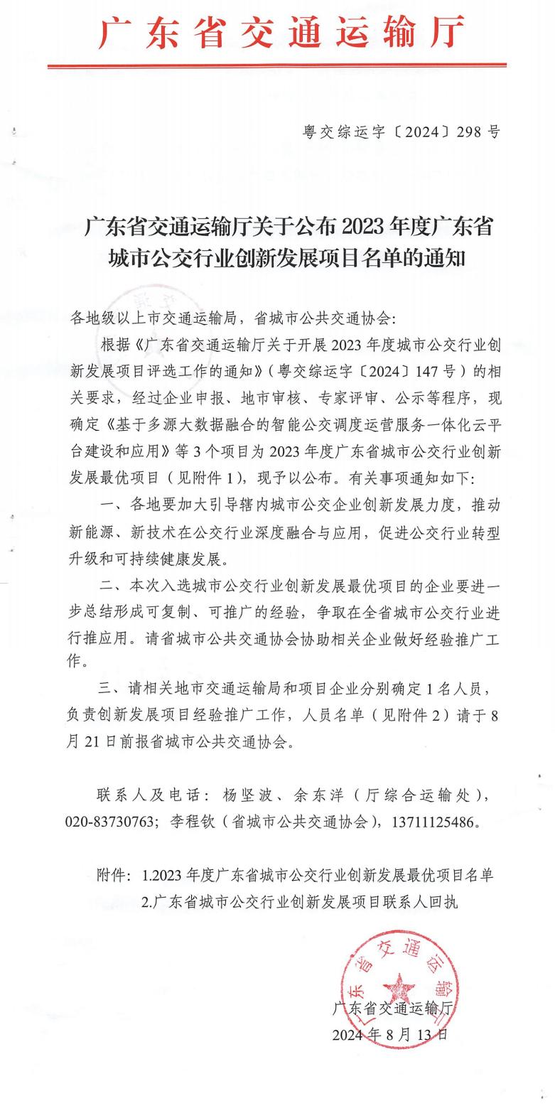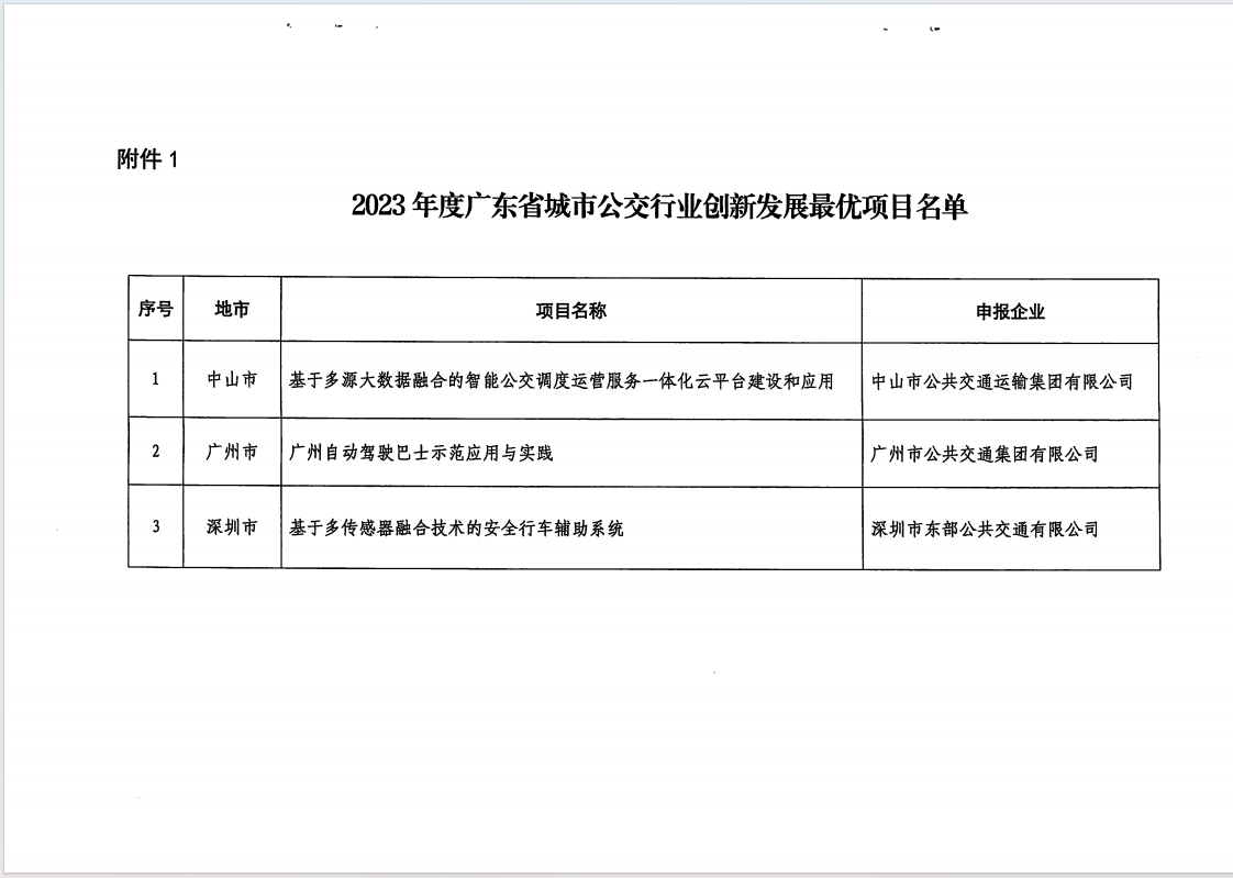 近日,广东省交通运输厅公布了2023年度广东省城市公交行业创新发展最优项目名单,中山公交集团的“基于多源大数据融合的智能公交调度运营服务一体化云平台建设和应用”项目荣登榜首,以第一名的成绩成功入选2023年度广东省城市公交行业创新发展最优项目。这是继7月24日“深中跨市公交ai及信息化建设”智慧公交项目荣获首届(广州)国际公共交通新能源和数字科技产业博览会创新奖项之后,又一重要殊荣。