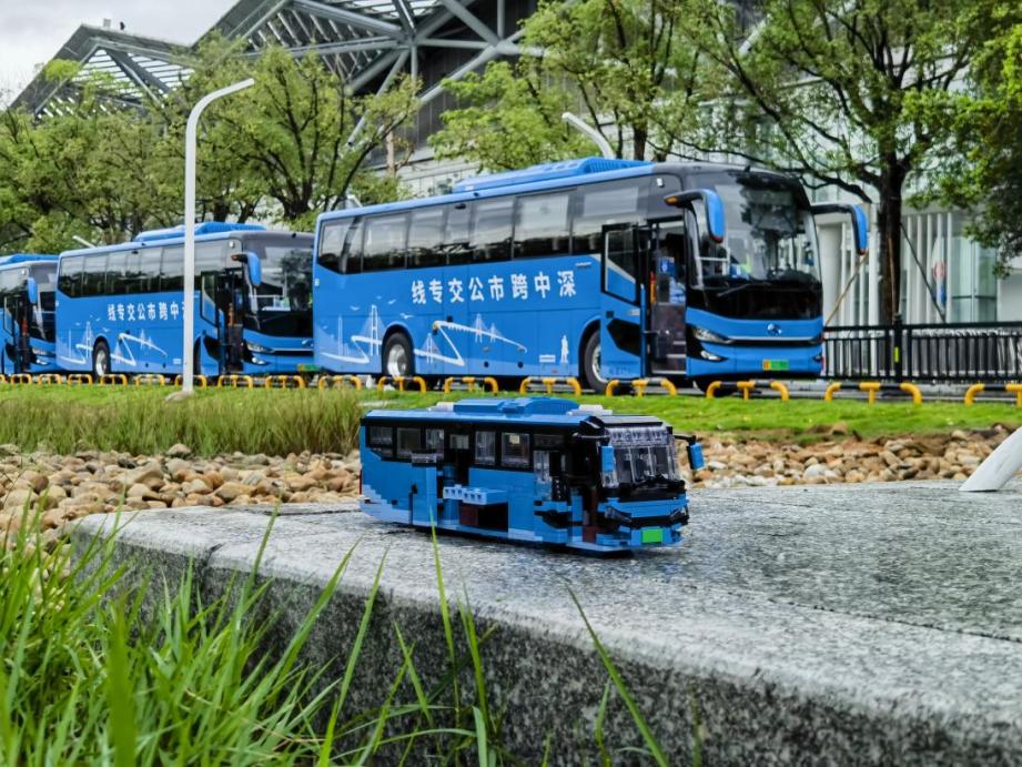 图为黄奕蜚自制模型与深中跨市公交合影