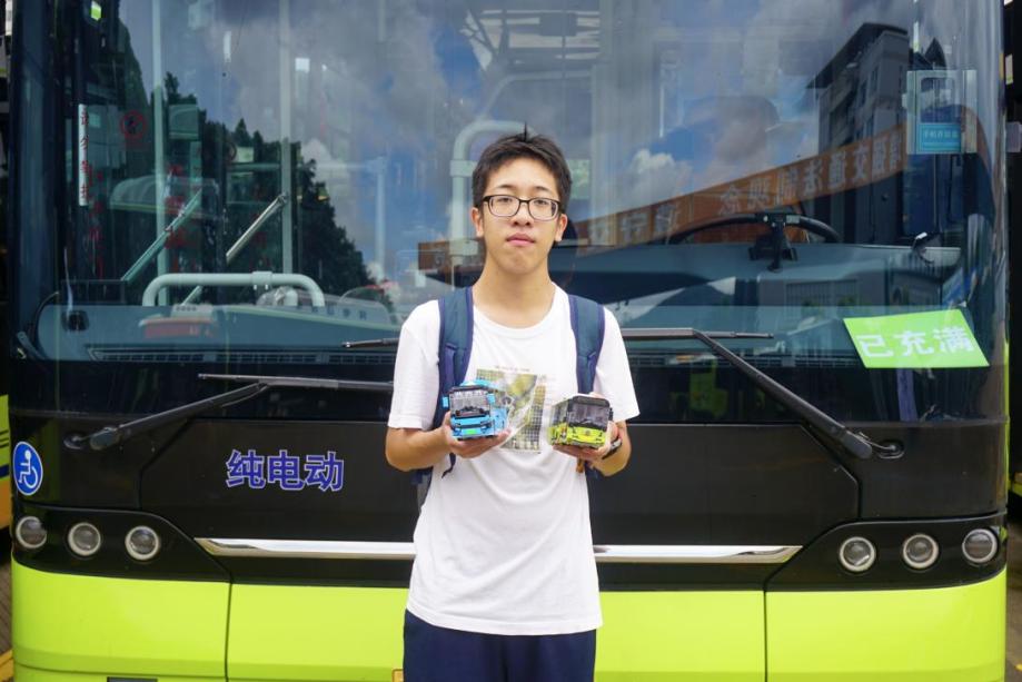 6月30日深中跨市公交开通当天,黄奕蜚带着自制的模型与深中跨市公交车合影,以自己的方式庆祝深中跨市公交开通。