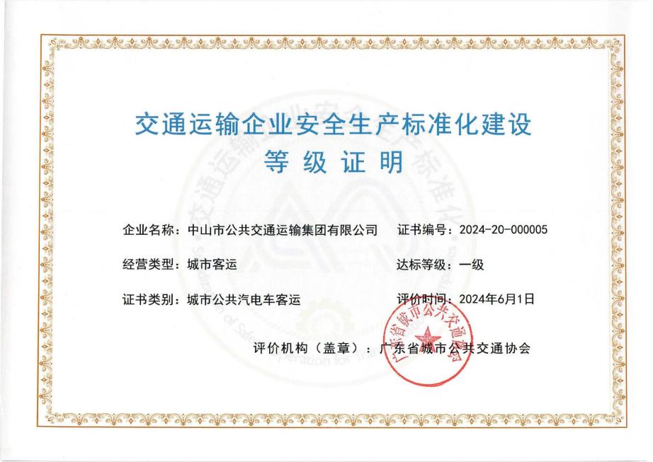 图为中山公交集团安全生产标准化建设通过一级达标评价证书