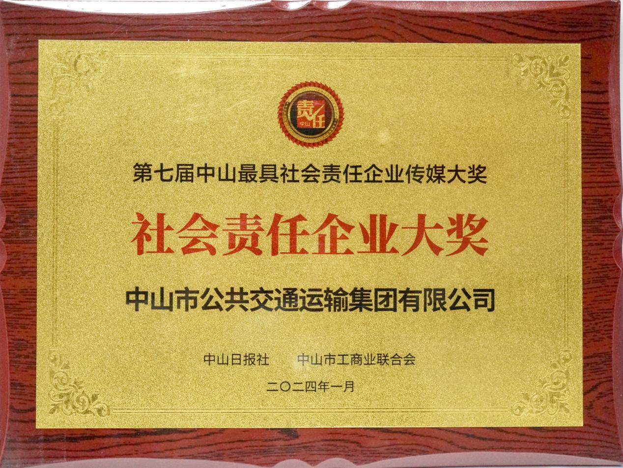 图为中山公交集团荣获“社会责任企业大奖”