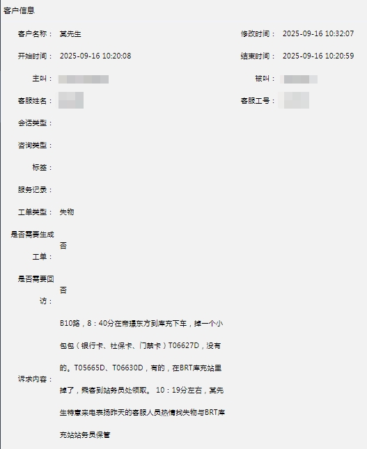 当天10时20分,一位先生致电公交客服中心,表扬公交客服人员朱碧荣及快速公交库充站站务员。原来,他前一天乘坐b10路公交车到库充站时,不慎将装有银行卡、社保卡等重要证件的包遗落在车上。等回过神来发现包不见后,他心急如焚,立即致电公交服务热线87330663寻求帮助。当班客服人员朱碧荣在接到电话后,一边耐心安抚这位先生焦急的情绪,一边详细询问乘车信息,很快便锁定相关车辆,经排查最终找到失物。考虑到实际情况,她沟通安排暂由库充站站务员妥善保管,并贴心地指引市民前往领取。领回失物时,这位先生如释重负,脸上终于露出了欣慰的笑容,对公交人的优质服务赞不绝口。