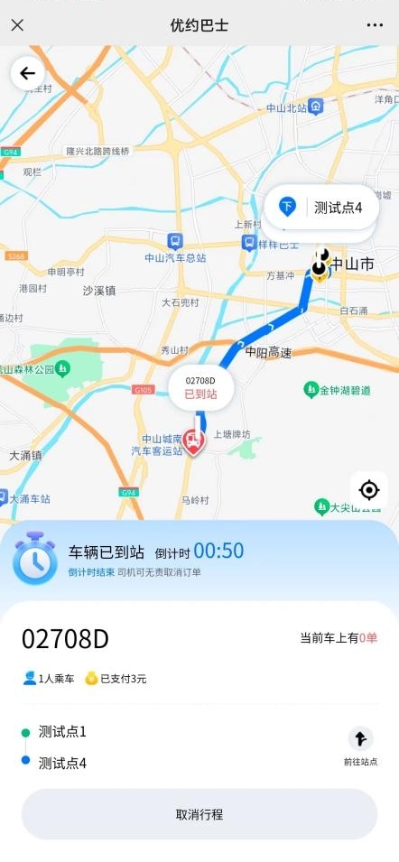 在优约巴士用户下单界面,提示车辆已到站且显示车辆实时定位,即便是优约线路的虚拟站点(在确保安全的情况下,为方便乘客出行灵活设置的无公交站牌站点)也能轻松找到上车点位置。