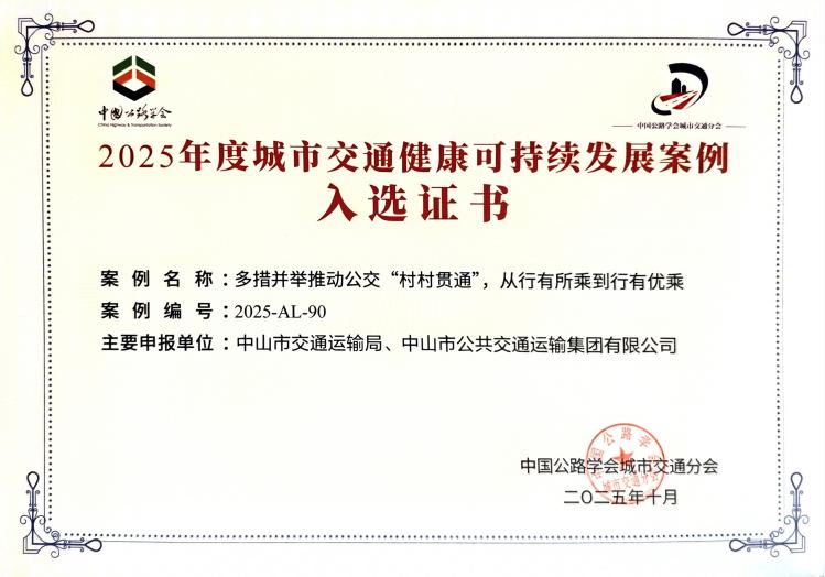 10月31日下午,中国公路学会城市交通分会举办的2025年学术年会暨城市交通高质量发展研讨会上,由中山市交通运输局和中山城建集团下属中山公交集团共同撰写的《广东中山:多措并举推动公交“村村贯通”,从行有所乘到行有优乘》案例成功入选《2025年度城市交通健康可持续发展案例》。《2025年度城市交通健康可持续发展案例》由中国公路学会城市交通分会组织征集并评审,旨在推广城市交通领域的优秀实践与创新成果。中山市“村村贯通”公交项目的入选,标志着中山市在推动城乡交通一体化、服务国家重大战略方面的探索与实践,为全国提供了可资借鉴的中山经验。